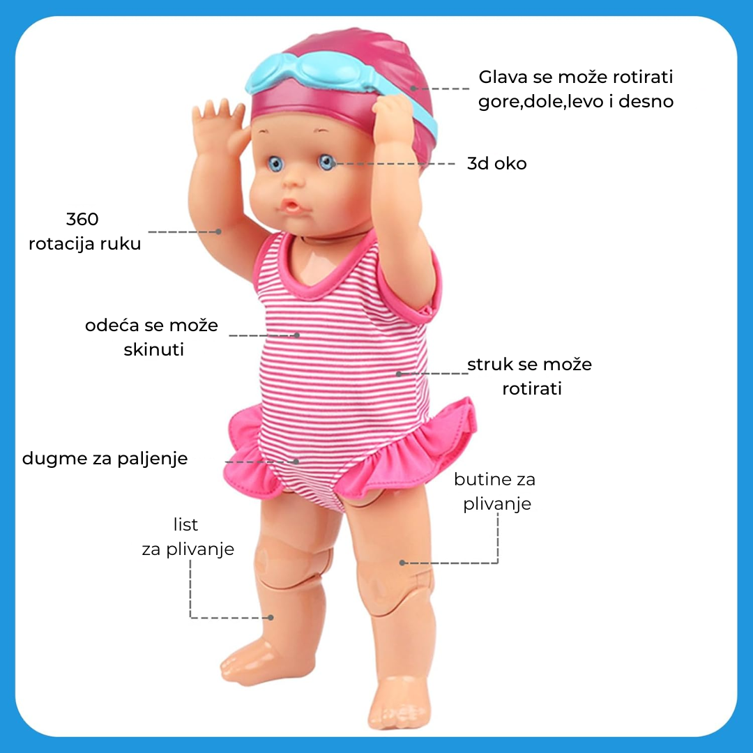 Lutka je napravljena tako da imitira realne pokrete plivanja. Deca mogu da je gledaju, imitiraju i kroz igru se polako oslobađaju straha od vode. Ako je tvoje dete ranije bežalo od kupanja – sada će samo trčati da se igra sa svojom lutkom.